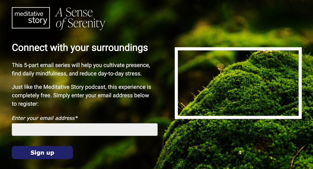 A Sense of Serenity is an email acquisition project that I spearheaded and coordinated for the Meditative Story podcast at WaitWhat. I worked with the show’s host to create a five-part email flow, each email focused on a different sense with a mindfulness prompt. At the end of the flow, the contact would be added to Meditative Story’s regular newsletter list, so we could keep the contact in our ecosystem. This campaign brought in over 500 new subscribers in its first month, and continues to grow.